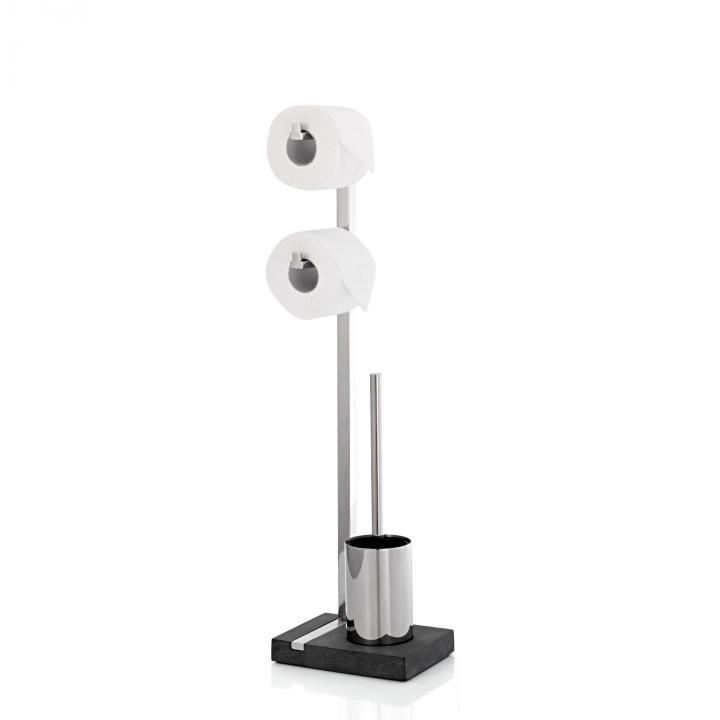 Stojan na dvě role toaletního papíru a WC kartáč MENOTO je vyroben z lesklé nerezové oceli, která kontrastuje s černým polystonem - materiálem podobným kamenině. Díky kombinaci dvou praktických pomocníků na toaletu si najde cestu do každé domácnosti.