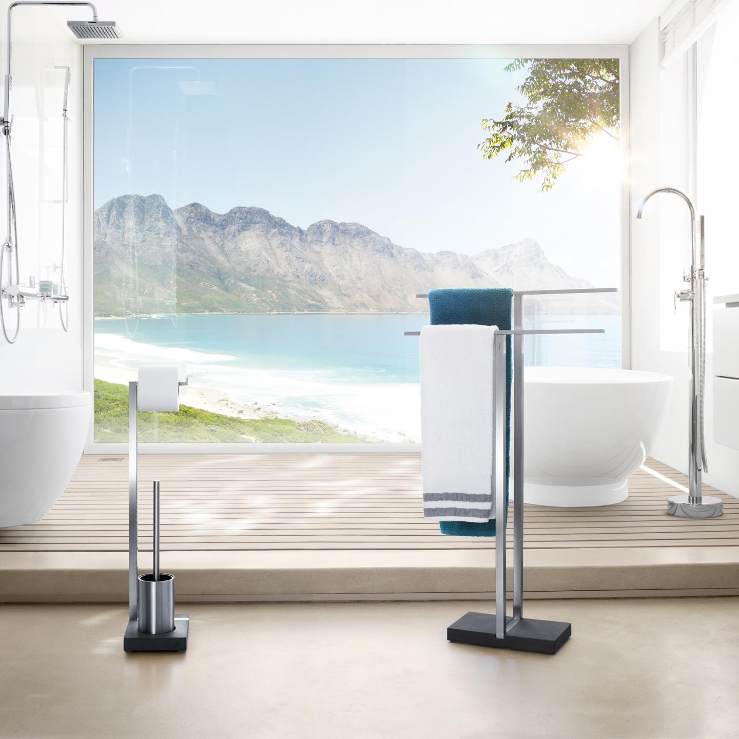 Stojan na toaletní papír a WC kartáč MENOTO je vyroben z lesklé nerezové oceli, která kontrastuje s černým polystonem - materiálem podobným kamenině. Díky kombinaci dvou praktických pomocníků na toaletu si najde cestu do každé domácnosti.