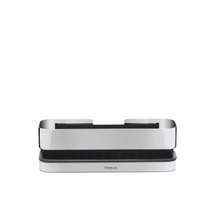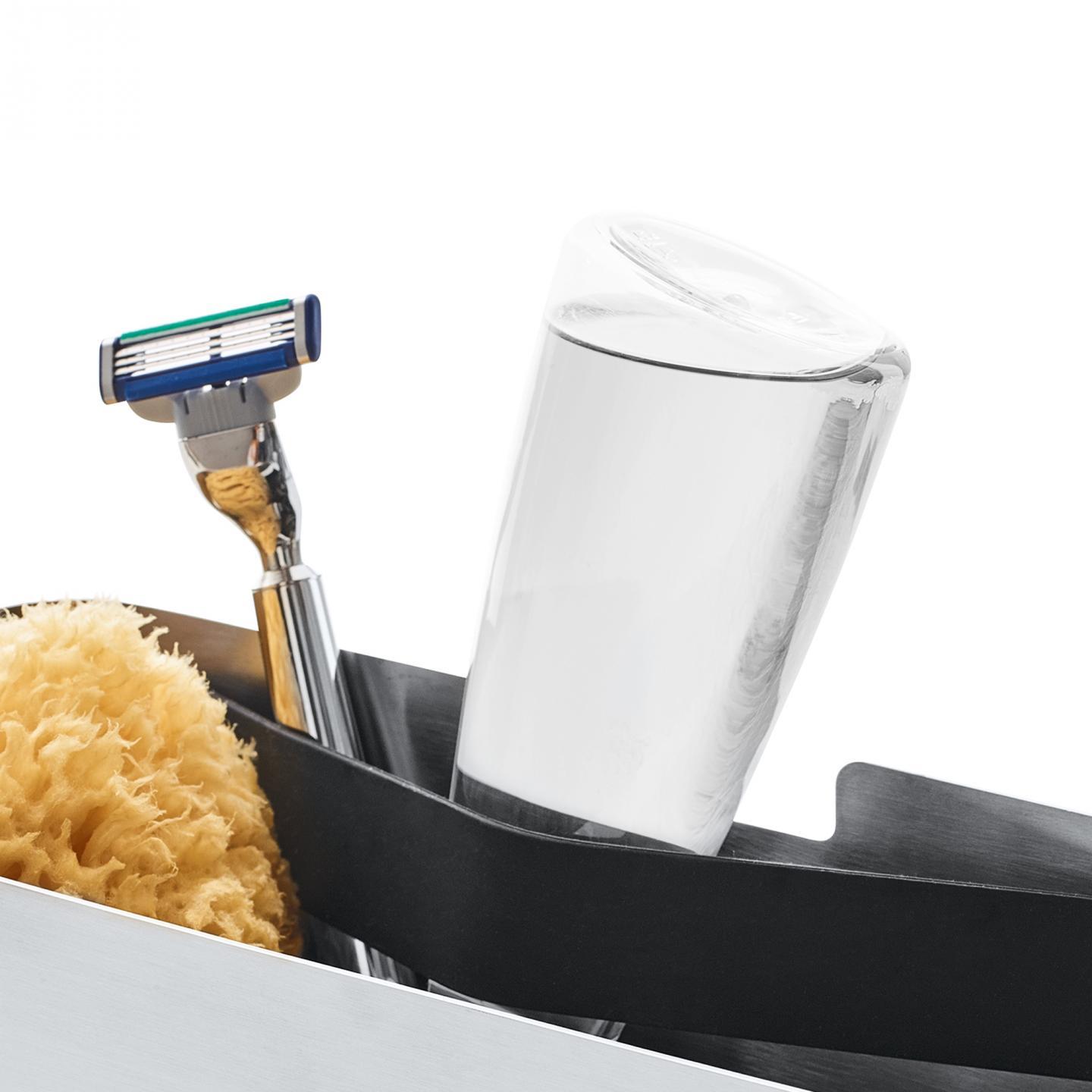 Nástěnná polička NEXIO se stane skvělým pomocníkem v každé koupelně. Je vyrobená z leštěné nerezové oceli, a tudíž se hodí do všech typů koupelen. Ať už potřebujete mít po ruce cokoliv, široký gumový pásek uvnitř udrží i drobnosti, jako jsou žiletky nebo menší tuby s kosmetikou. Dno poličky má vyjímatelnou gumovou protiskluzovou vložku, kterou v případě potřeby snadno vyndáte a opláchnete.