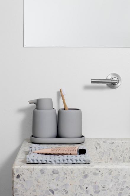 Zaoblené okraje, jemný tvar a příjemně měkká povrchová úprava: kelímek na zubní kartáčky SONO zaujme svým jedinečným designem. Keramika potažená silikonem již na první pohled působí luxusně a na dotek je velmi příjemná.