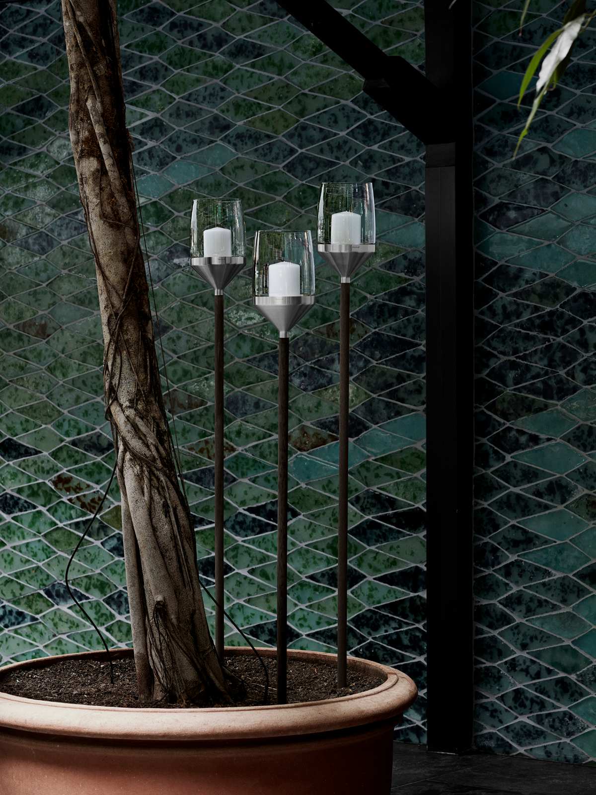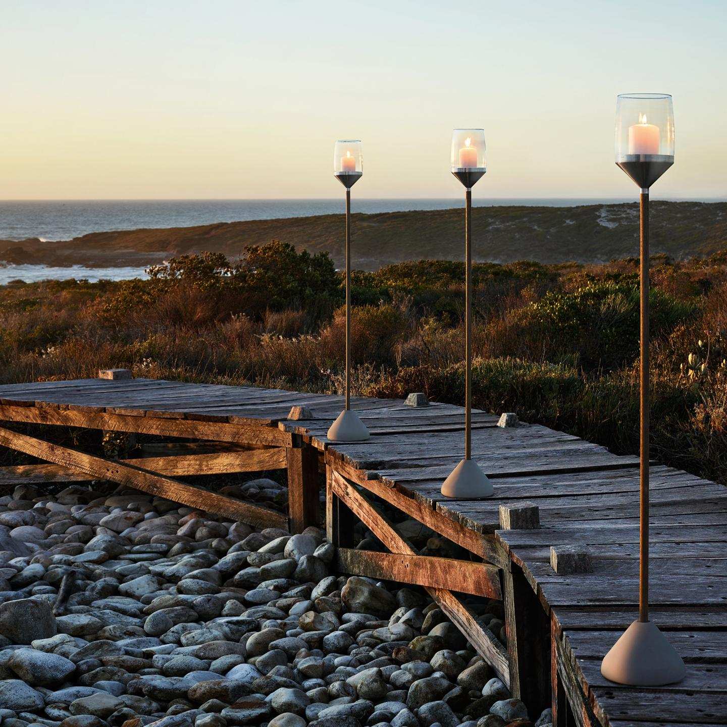Netradiční zahradní svícen ATMO svým vzhledem připomíná pochodně a je krásným zahradním doplňkem pro každého, kdo má rád jednoduché, ale nápadité dekorace. Základna je vyrobena z matné nerezové oceli a skleněného krytu, který chrání svíčku před sfouknutím. Elegantní lucerna je posazena na tvrdé dřevo, které odolá i nepřízni počasí; zpříjemnit si večery romantickou atmosférou tak můžete v létě i v zimě.