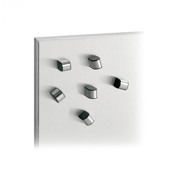 Set magnetů TEWO je vyrobený z matné nerezové oceli a černého plastu. Zajímavý a moderní design obohatí jakýkoliv magnetický povrch.