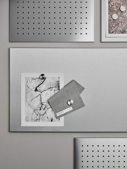 Magnetická tabule MURO je vyrobená z matné nerezové oceli a jistě ji oceníte nejen v kanceláři, ale i v domácnosti. Zavěsit si ji můžete svisle nebo vodorovně podle toho, co na tabuli chcete umístit. V kanceláři nalezne praktické využití pro připevnění seznamů a pracovních poznámek. Doma si pak tabuli můžete vyzdobit fotkami vaší rodiny nebo na ní připevnit vzkazy a nákupní seznamy.