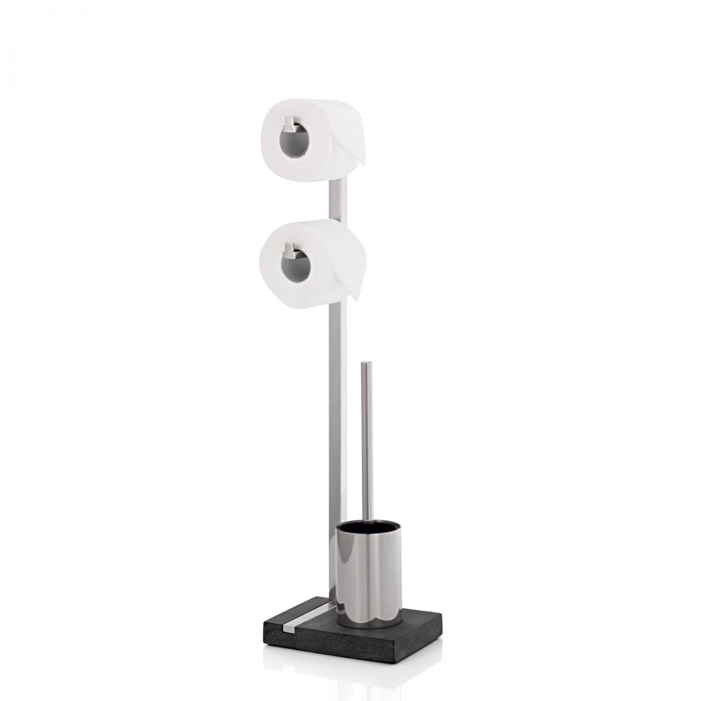 Stojan na dvě role toaletního papíru a WC kartáč MENOTO je vyroben z matné nerezové oceli, která kontrastuje s černým polystonem - materiálem podobným kamenině. Díky kombinaci dvou praktických pomocníků na toaletu si najde cestu do každé domácnosti.