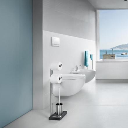 Stojan na dvě role toaletního papíru a WC kartáč MENOTO je vyroben z lesklé nerezové oceli, která kontrastuje s černým polystonem - materiálem podobným kamenině. Díky kombinaci dvou praktických pomocníků na toaletu si najde cestu do každé domácnosti.