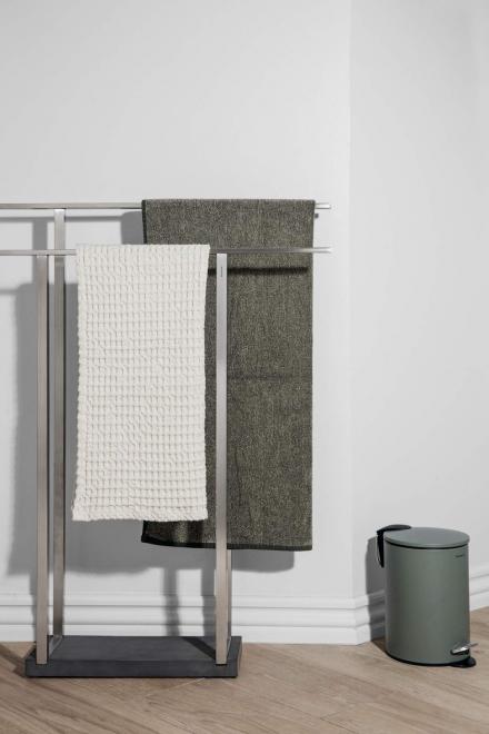 Stylový stojan na ručníky MENOTO v decentním designu perfektně doplňuje moderní koupelny. Podstavec z černého polystonu kontrastuje s chladným matným nerezem a dodává stojanu luxusní vzhled. Stojan můžete jednoduše postavit tam, kam zrovna potřebujete, a mít tak ručníky vždy suché a po ruce.